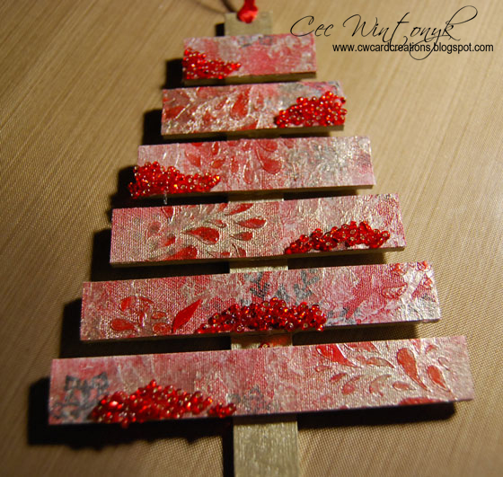 Distress Paint and highlighted with DecoArt Raw Umber Antiquing Cream. I added some poinsettias cut with Tim Holtz