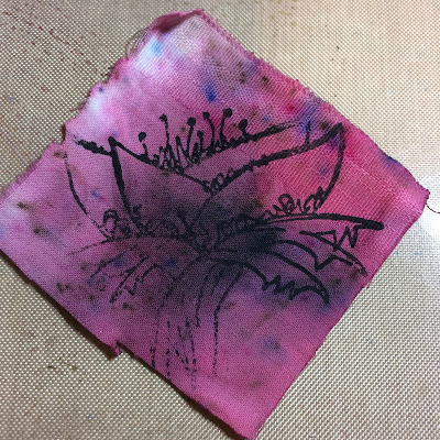Here is my completed background. You can see flecks of watery gesso and how that reacted to the colors and stamping in DOX, lightly spritzed to activate the oxidization. Below is a peek of my finished canvas.
