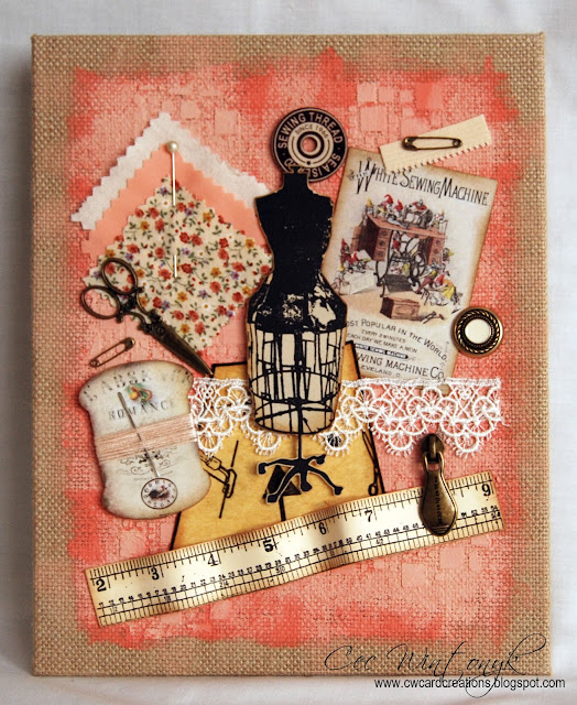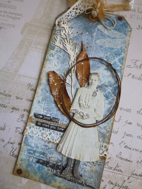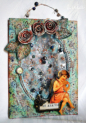 So far, so good! When the moulding paste was completely dry, I sprayed the surfaces with Imagination Crafts Media Ink Sprays. I have three colours, Magenta, Light Green, and Yellow. I also have one called Liquid Gilt which is just gorgeous!.......