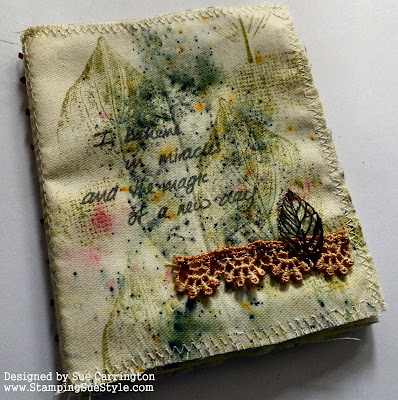 After some more drying, it was time to add the finishing touches and to sort out some of my stamps. I decided not to use any dimensional embellishments, as the binder will be used frequently and there's always a risk of knocking off raised elements. I did however add a handle by plaiting together some lengths of sari silk ribbon. This is wonderful stuff, so colourful. I punched a couple of holes in the spine, added some rivets for strength, then threaded the ribbon through. I secured it with a knot at either end. It was then time to load up my stamps. I've just used clear stamps, as I find these more difficult to store. I get very irritated by the cellophane wrappers! Here's the inside.........