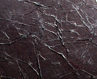 I also punched two holes along the top edge, to correspond with the rings in the ring binder. I used six sheets altogether. I also cut twelve sheets of acetate to the same size and punched holes in them. I put all of these to one side, and returned to the ring binder. I wasn't too sure what to do with the inside. I wanted to keep it plain but the surface was a bit rough, so I knew I had to cover it with paper rather than just paint it. I decided to use some scrunched up black tissue paper. I think this is effective because, although plain in colour the 'wrinkles' provide an interesting textured surface. I applied a liberal coating of Mod Podge on the inside cover, layered the tissue onto the surface and then painted more Mod Podge over the tissue.